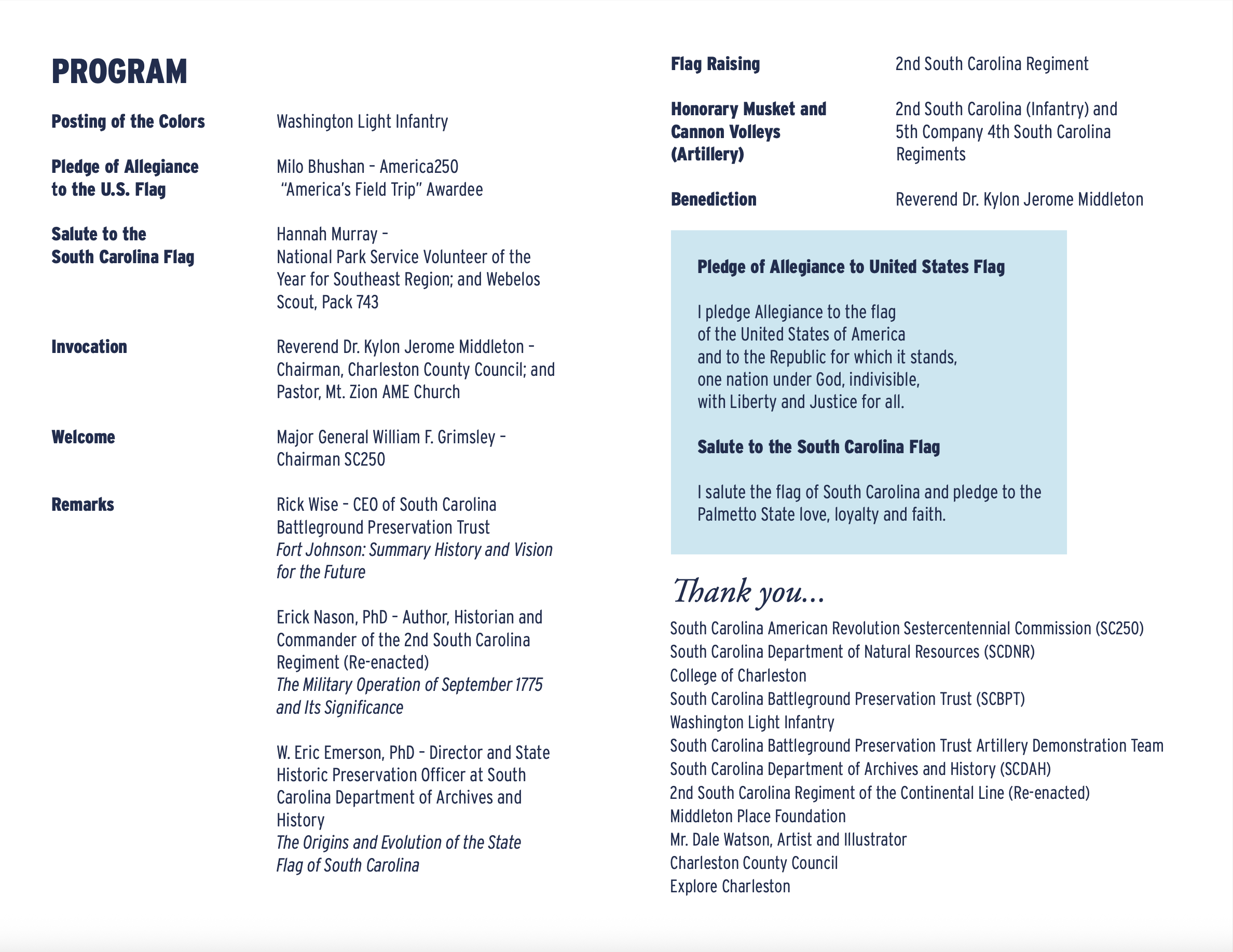 This past weekend, SC250 Charleston and the SC Battleground Trust gathered at historic Fort Johnson on James Island to commemorate the 250th anniversary of SouthCarolina’s first flag raising ✨