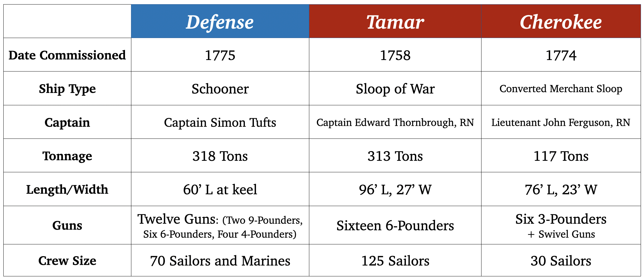 Broadly speaking, neither royal vessel was a large frigate, but their combined firepower allowed the duo to control access to Charles Town harbor. Cherokee was a former merchant sloop, with a burthen (i.e. cargo carrying capacity) of 117 tons, a length of seventy-six feet, a breadth of twenty-three feet, a complement of thirty sailors, and a relatively small armament of six three-pounder guns and sundry swivel guns. 6 Far more fearsome was Tamar, a well-armed sloop-of-war. Unlike the small, single-masted Bermuda sloops favored by pirates and privateers of earlier decades, sloops-of-war were three-masted vessels that combined the versatility and speed of lighter vessels with the firepower of larger Royal Navy warships. Tamar was over ninety-six feet in length, twenty-seven feet in breadth, and had a burthen of 313 tons. She was designed to have a complement of 125 sailors and was armed with sixteen six-pounder guns (outside of her swivel guns). 7
