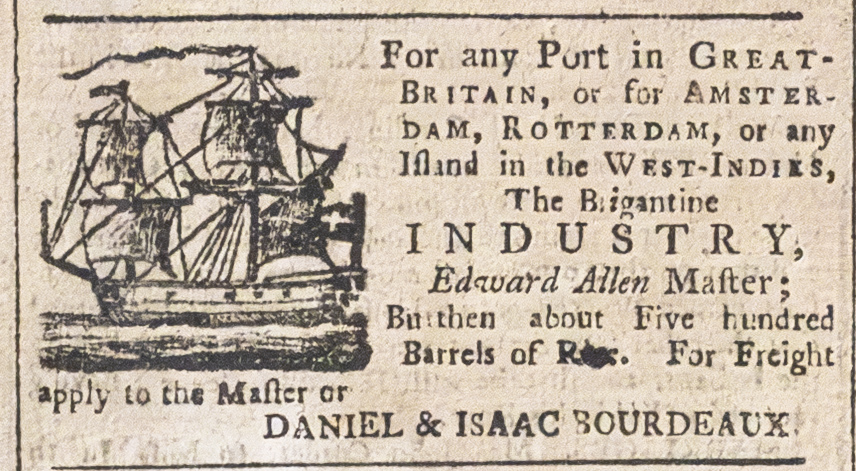 On the front page of the May 12, 1775, edition of The South Carolina and American General Gazette – the second newspaper to break the news in Charleston- is a prominent advertisement for the ship Industry, the same ship captained by Edward Allen that brought the Essex Gazette newspapers and other letters from Massachusetts. Here, Master Allen is advertising that he is ready to accept any freight that needs to be shipped to “Great Britain, or for Amsterdam, Rotterdam, or any Island in the West-Indies.”